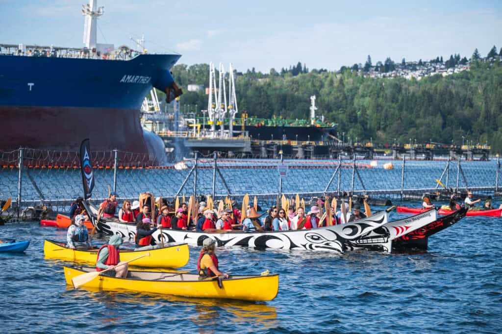 Water protectors gathered in front of an oil tanker being loaded with diluted bitumen at Trans Mountain’s Westridge Marine Terminal in Burrard Inlet this June.